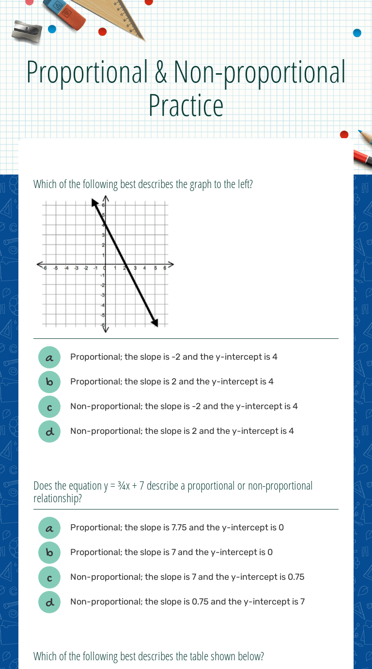 Determine if each relationship is a proportional or nonproportional situation. These worksheets and lessons will help students identify just about any proportional relationship that may exist between several data sets. Tables, graphs, and equations for proportional and. The linear equation y = mx + b is a proportional linear relationship between y and x . Constant multiple between measures of and measures of when given in a table. Students study examples of relationships that are not proportional in . Download worksheets for grade 7, module 1, lesson 5 . (assume that the tables represent linear relationships.). Fill out, securely sign, print or email your proportional and non proportional relationship review.pdf . Use the graphs to determine proportionality. Proportional relationship worksheets 8th grade pdf. Which graph shows a proportional relationship? Refer to the skills practice worksheet for lesson 6.1 in the student assignments book for additional.